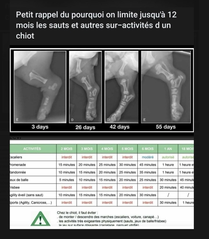 L'activité du chiot doit être limitée et adaptée en fonction de sa race et de son âge. Les efforts violents, longs, les sauts, les chocs peuve...